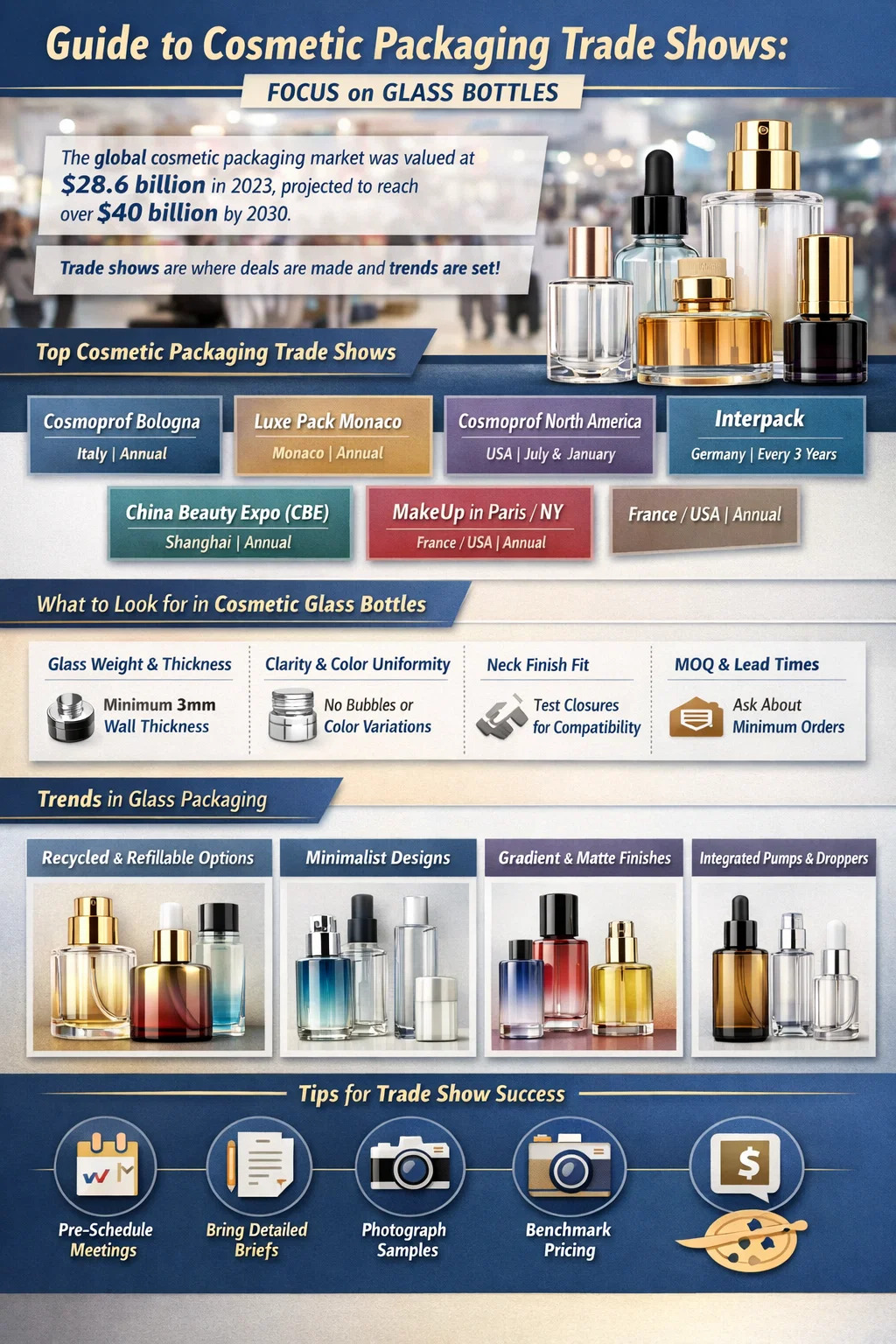 Ha kozmetikai termékek csomagolását szerzi be – különösen olyan prémium anyagokat, mint pl kozmetikai üvegpalackok — a megfelelő szakkiállításokon való részvétel az egyik leghatékonyabb döntés, amelyet meghozhat. Egyetlen helyszínen több száz beszállítót hasonlíthat össze, fizikai mintákat kezelhet, közvetlenül tárgyalhat az árakról, és olyan kapcsolatokat építhet ki, amelyek megismétlése e-mailen keresztül hónapokig tart. A kozmetikai csomagolások globális piacát kb 28,6 milliárd dollár 2023-ban és az előrejelzések szerint 2030-ra több mint 40 milliárd dollár lesz a Grand View Research szerint. A kiállításokon a piac jelentős része formálódik – üzleteket kötnek, trendeket határoznak meg, és beszállítói hálózatokat építenek ki.