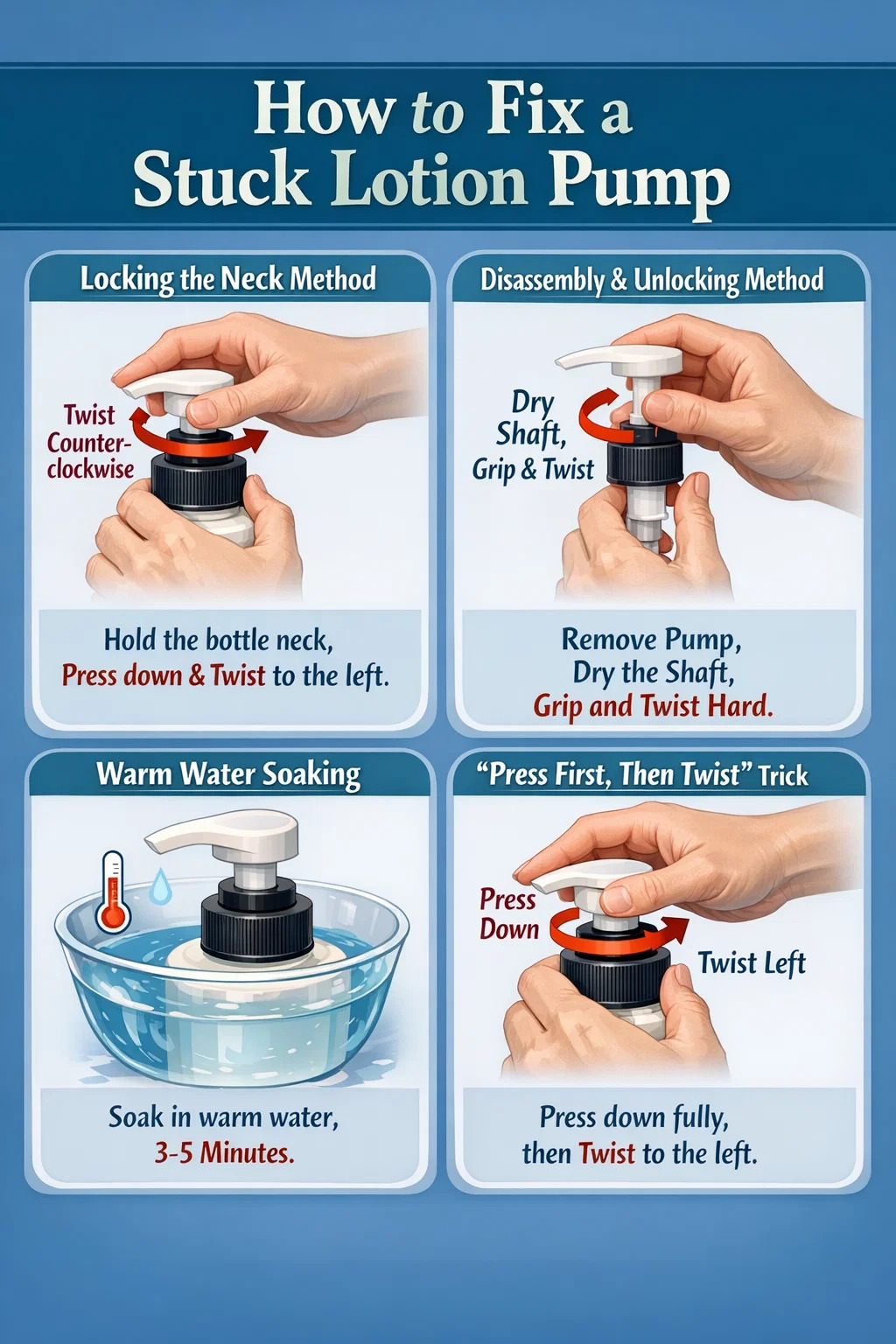 Ez a leggyakoribb és leghatékonyabb módszer. A krémpumpa gyakran nem ugrik fel, mert amikor elforgatja a felső pumpafejet, az alatta lévő kupak is elfordul, megszüntetve az erőt.
