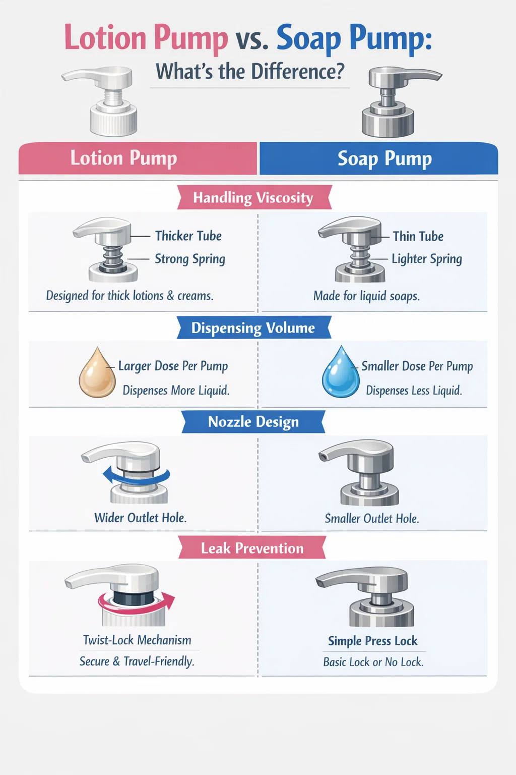 Lotion Pump: sűrű, viszkózus lotionok, krémek vagy kondicionálók kezelésére tervezték. Szívócsöve általában vastagabb, a belső rugó pedig erősebb tolóerővel rendelkezik, így még nagyon sűrű folyadékokat is felszív.